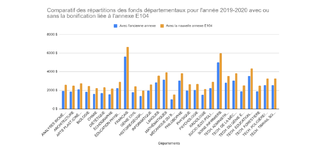 Un petit rappel : l’annexe E104 - Programme « Perfectionnement des enseignants » (désolé mesdames) remplacera jusqu’à nouvel ordre une ancienne annexe dont le numéro m’échappe. Ce changement apporte de nouveaux fonds, dont 63 000 beaux dollars qui seront ajoutés à notre budget de perfectionnement pour l’année 2019-2020. Depuis le mois d’août, nous vous avons consultés lors de nos instances syndicales pour nous doter de balises afin de conclure une entente de répartition avec la direction des Études.