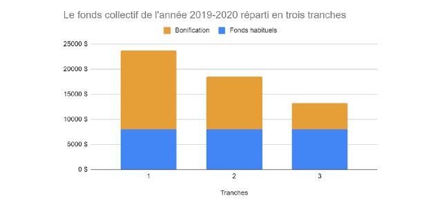 Comme par le passé, le fonds collectif sera réparti en trois tranches disponibles à différents moments de l’année. Les fonds normalement disponibles seront distribués également pour porter chaque tranche à environ 8 000 $, puis le reste de la nouvelle annexe sera répartie à raison de la moitié dans la première tranche, le tiers dans la seconde tranche et le reste dans la troisième.